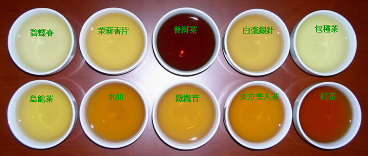 黃色、綠茶呈蜜綠色、鐵觀音茶呈琥珀色、白毫烏龍茶呈鮮麗橙紅色等。喝茶行家者觀看茶湯色就可以知